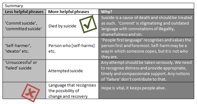 - The phrase ‘commit* suicide’ is avoided in all contexts (outside of quoted prose) – this language is outdate, inaccurate and stigmatizing (conveying unhelpful notion of illegality and immorality). Instead, consider phrases such as ‘died by suicide’.
